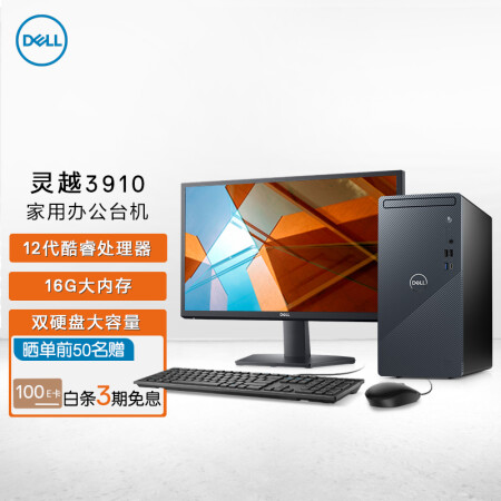 戴尔DELL灵越3910 家用办公电脑 商务台式机电脑主机 12代i5-12400 16G 256G+1T 三年上门 23.8英寸整机